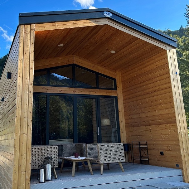 Drei Autominuten vom Hotel Alpenhof Bayrischzell entfernt können Sie das atemberaubende Alpenpanorama auf einer der Terrassen der zahlreichen Alpen-Tinychalets der Glockenalm genießen.