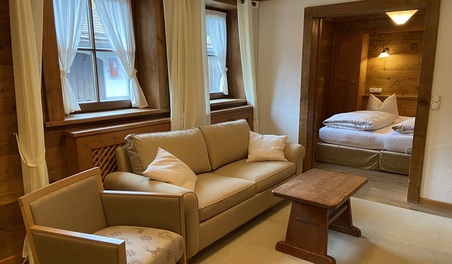 Die Suite Franz-Josef ist sehr geschmackvoll ganz in Holz eingerichtet. Sie ist 45 qm groß und verfügt über einen räumlich abgetrennten Wohn- und Schlafbereich, ein Doppelbett mit Holz-Baldachin, zwei Schreibtische, zwei Sessel und ein Sofa, das zu einem Bett für 2 weitere Personen umfunktioniert werden kann. Des Weiteren ist die Suite ausgestattet mit TV, Dusche/Badewanne/WC und WLAN.