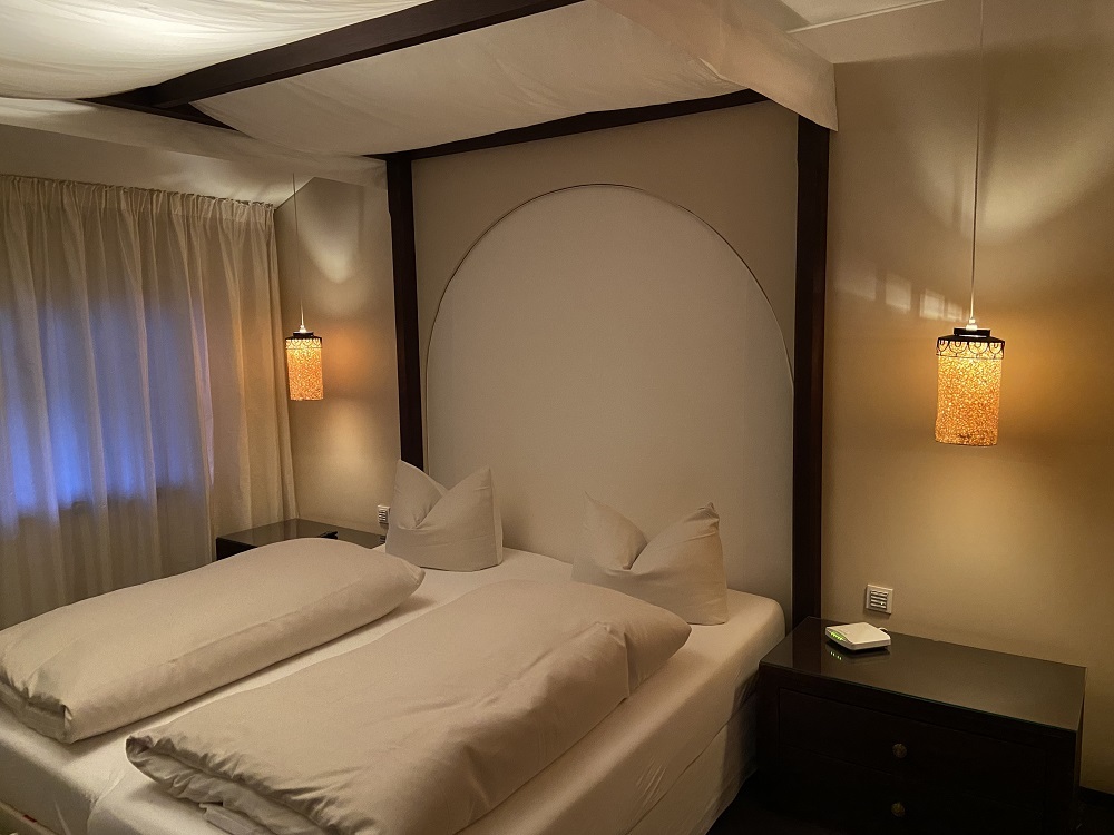Hier werden Träume aus 1001 Nacht wahr: Die Suite Salome im orientalischen Stil mit Schlaf- und Wohnbereich ist 40 qm groß und verfügt über ein Doppelbett, Balkon und zwei Sofas, die zu zwei Betten für 2 weitere Personen umfunktioniert werden können. Des Weiteren ist die Suite ausgestattet mit TV, Dusche und Badewanne/WC und WLAN.