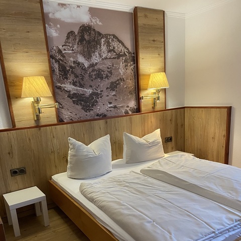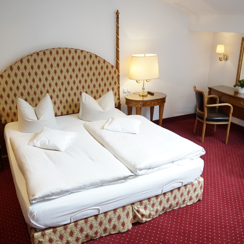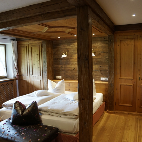 Die Suite Franz-Josef ist sehr geschmackvoll ganz in Holz eingerichtet. Sie ist 45 qm groß und verfügt über einen räumlich abgetrennten Wohn- und Schlafbereich, ein Doppelbett mit Holz-Baldachin, zwei Schreibtische, zwei Sessel und ein Sofa, das zu einem Bett für 2 weitere Personen umfunktioniert werden kann. Des Weiteren ist die Suite ausgestattet mit TV, Dusche/Badewanne/WC und WLAN.