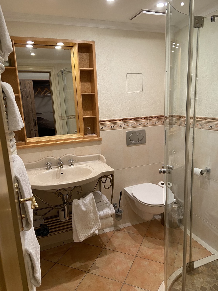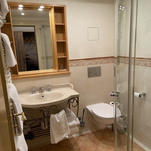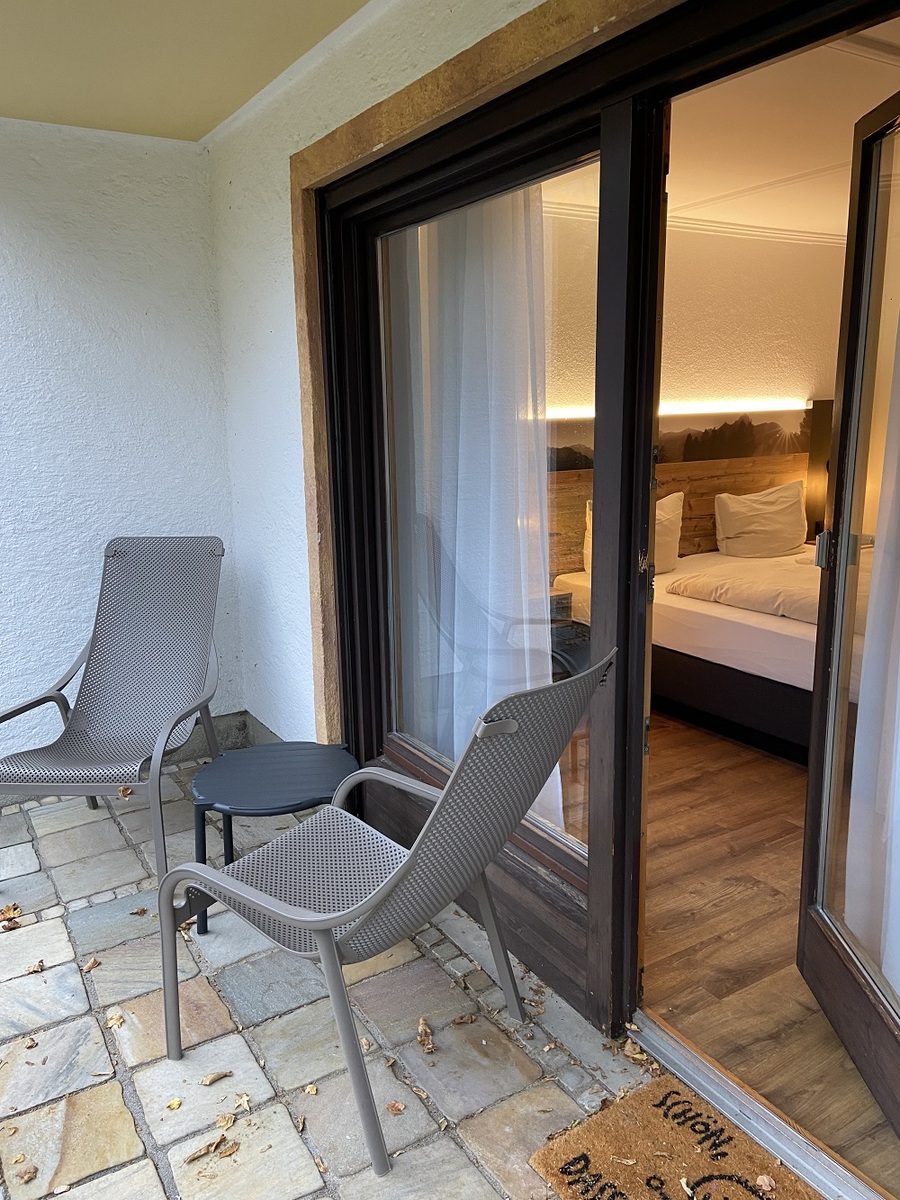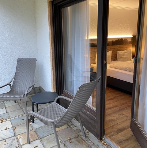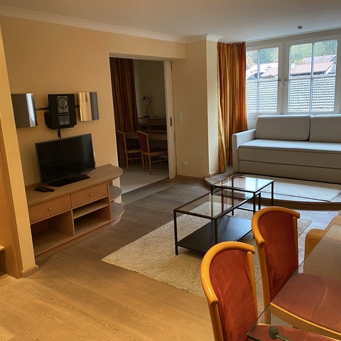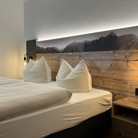 Ein grandioser Blick auf den Wendelstein: Die Suite Firenze im italienischen Stil mit Schlaf- und Wohnbereich ist 45 qm groß und verfügt über ein Doppelbett, Schreibtisch, Balkon und zwei Sofas, die zu 2 Betten für 4 weitere Personen umfunktioniert werden können. Sie wird gerne als Hochzeitssuite gebucht. Desweiteren ist die Suite ausgestattet mit TV, Dusche/WC und WLAN.