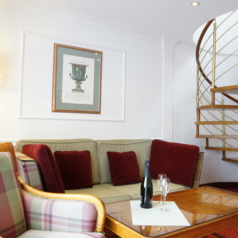 Exklusives Urlaubsfeeling auf zwei Ebenen: Die Suite Michelangelo ist 40 qm groß und verfügt über einen durch eine Wendeltreppe räumlich abgetrennten Wohn- und Schlafbereich, ein Doppelbett, Schreibtisch, Balkon und ein Sofa, das zu einem Bett für 2 weitere Personen umfunktioniert werden kann. Des Weiteren ist die Suite ausgestattet mit TV, Dusche/Badewanne/ WC, separates WC und WLAN.