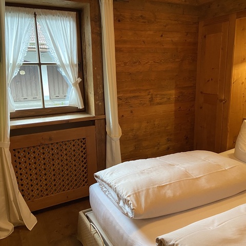 Die Suite Ludwig Thoma ist ganz in Holz gehalten. Sie ist 35 qm groß und verfügt über einen räumlich abgetrennten Wohn- und Schlafbereich, ein Doppelbett, Schreibtisch und ein Sofa, das zu einem Bett für 2 weitere Personen umfunktioniert werden kann. Des Weiteren ist die Suite ausgestattet mit TV, Dusche/WC, separates WC und WLAN.